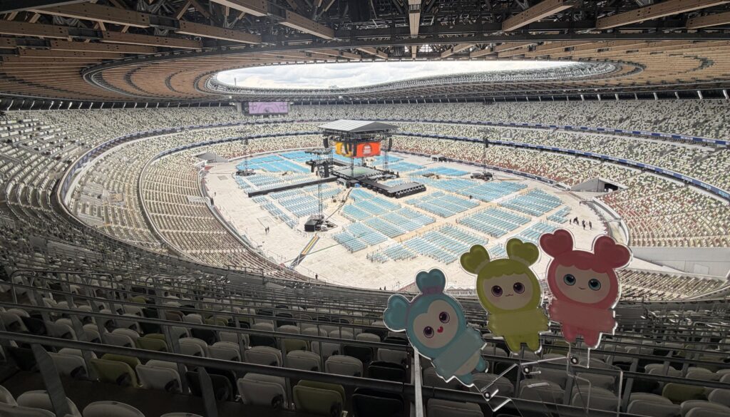 国立競技場ライブは、中央ステージ(+左右にL字)に加えて、花道がメインスタンド側に伸びる形に。